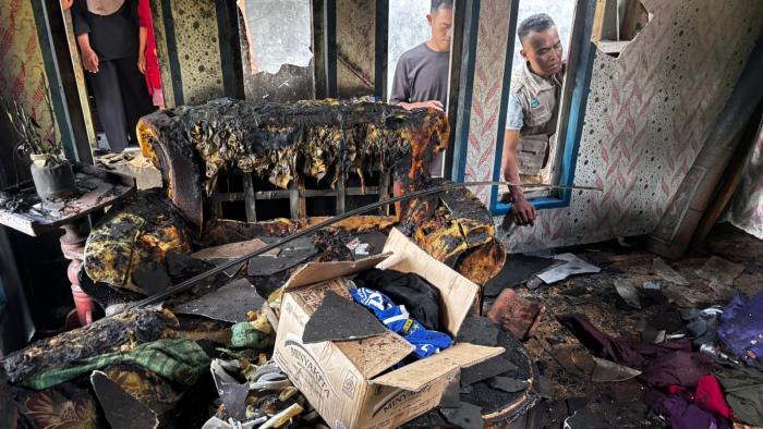 “Tak lama kemudian, api menjalar cepat membakar bagian atap yang terbuat dari kayu dan genting. Kursi dan barang-barang di ruang tengah ikut terbakar sebelum akhirnya api menyambar ke dua kamar tidur,” terang Kapolsek.
