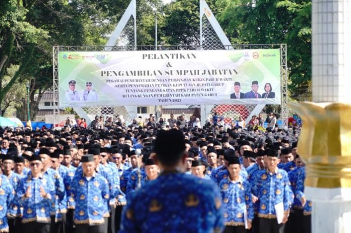 GARUT INTAN NEWS– Sebanyak 6.596 Pegawai Pemerintah dengan Perjanjian Kerja Paruh Waktu (P3KPW) di lingkungan Pemerintah Kabupaten Garut resmi dilantik oleh Bupati Garut, Abdusy Syakur Amin, pada Jumat (7/11/2025) di Lapangan Otto Iskandar Dinata (Alun-Alun Garut).