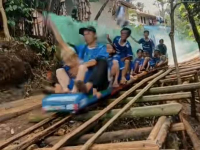 Rel tersebut dibuat dari batang pohon pinang atau aren yang disusun memanjang mengikuti kontur tanah dari area menanjak ke menurun. Panjang lintasannya bahkan bisa mencapai sekitar 150 meter, sehingga memberikan sensasi meluncur yang cukup panjang bagi anak-anak.